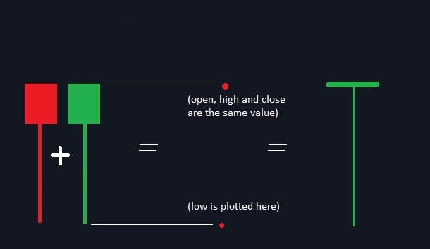 Thus you have the OHLC values for forming a new candle which is the sum of the previous two. By tracing the 4 points from the two candles in the image, and adding them it forms a new candle representing that the value has gone down tremendously and then recovered that amount.